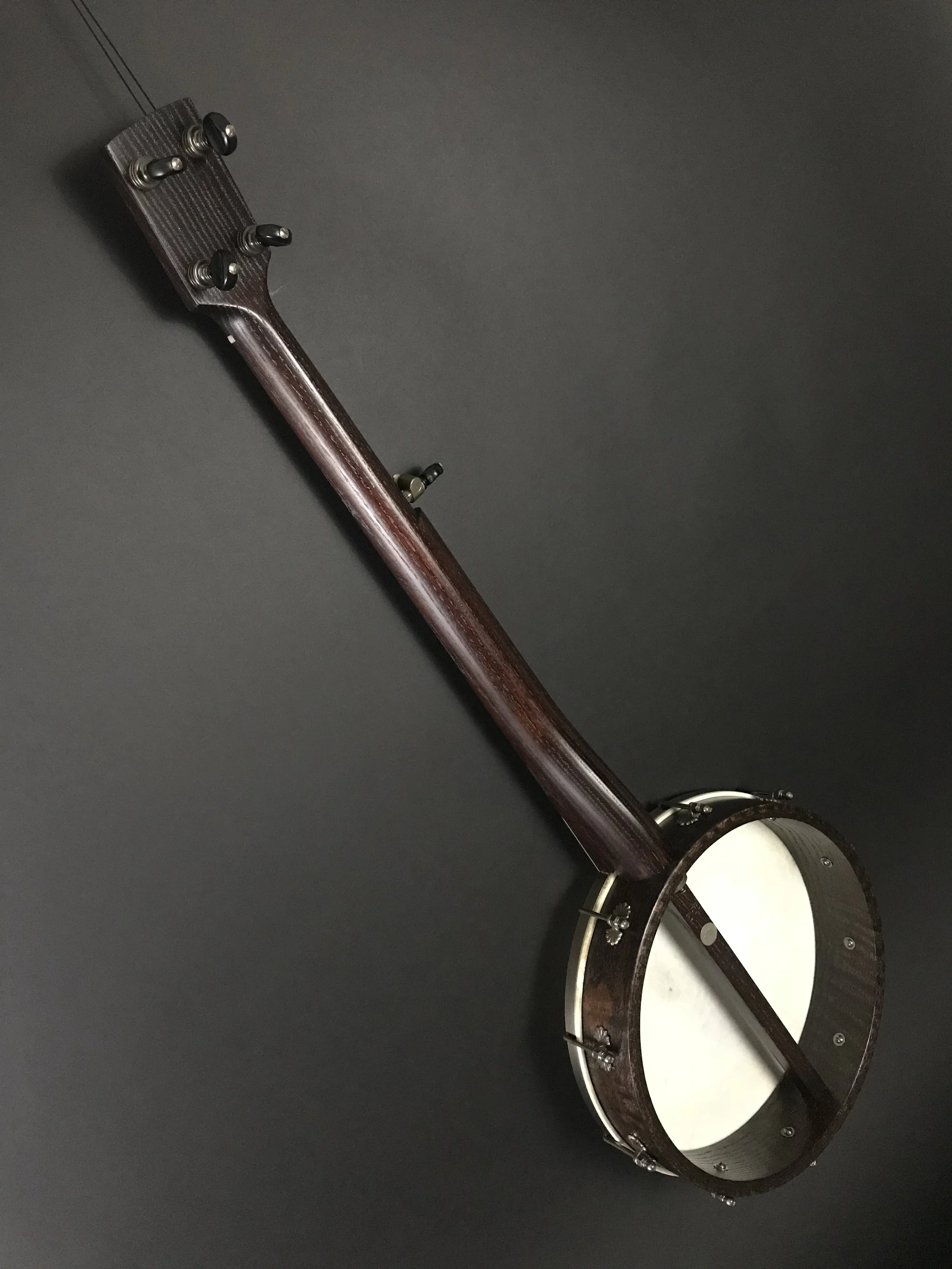 This is a 10L fretless banjo with an ash neck and curly red oak rim. It has silver coins inlayed from the 1860’s. Strung with nylgut classic strings. No fret markers on these banjos, move the bridge to the tone you want. This banjo stayed in the Portland area.